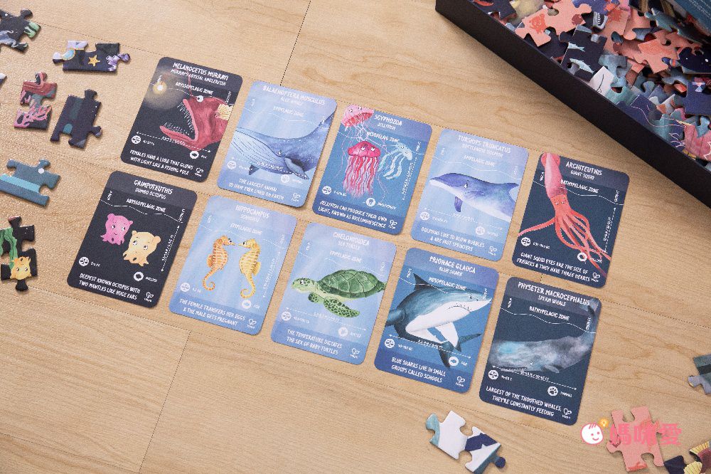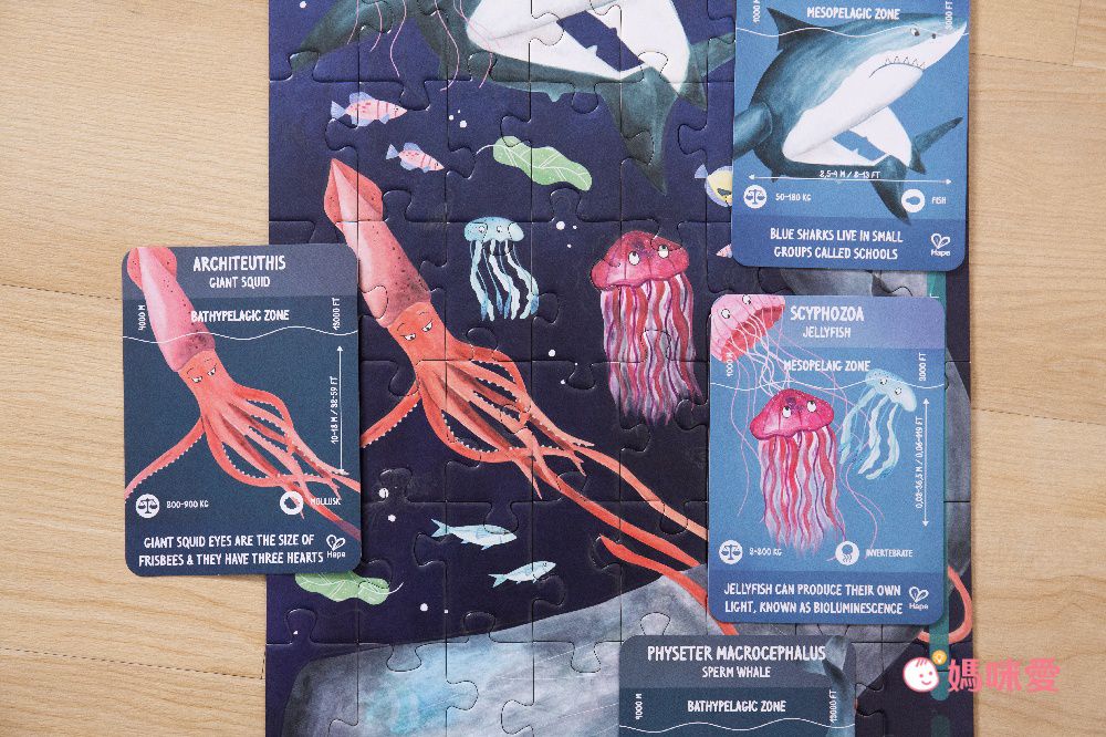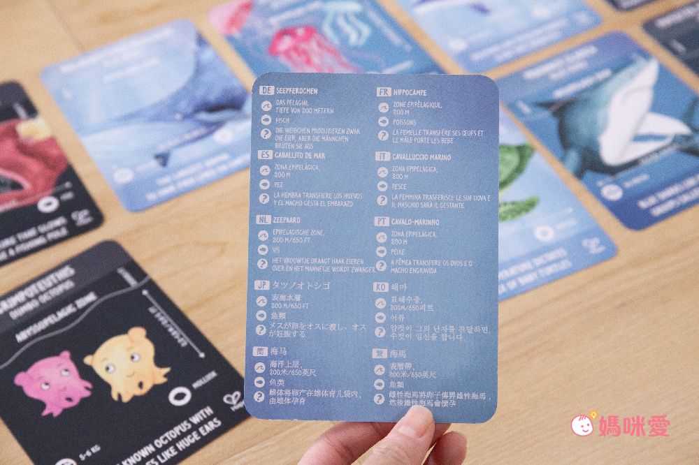 圖卡的背面是生物的名稱、生活在海洋的哪一層、大約多少公尺深、是什麼類別的海洋生物以及生物的特點都寫在上面!同時還是多語言版本,可以同時學習英文呦!(小提醒:此款為國際版,因此僅有簡體中文&粵語版本的繁體中文)