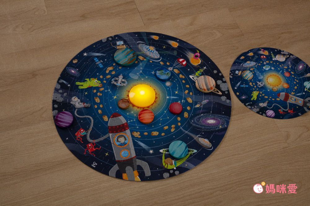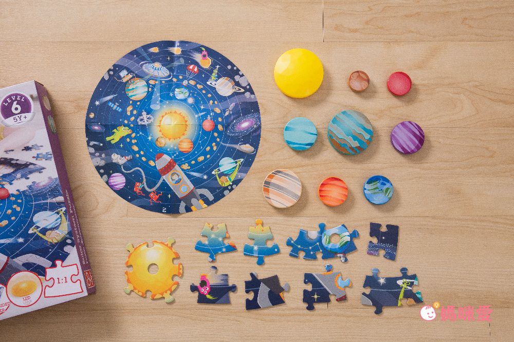把燈光稍微調暗一些,就可以感受這拼圖迷人的魅力~發亮的太陽代表炙熱的太陽在中間燃燒,而其他周圍的行星一起圍繞的太陽轉~這組拼玩不只有滿滿的成就感,還帶有非常豐富的知識含量!