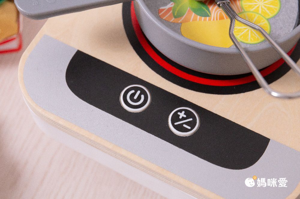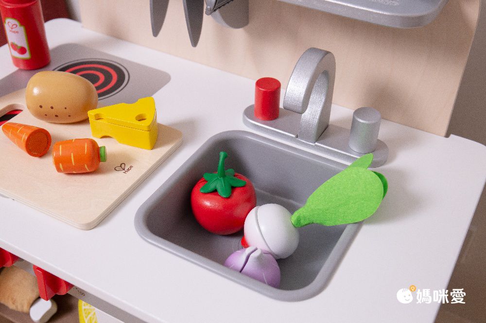 檯面上除了有瓦斯爐,還有一個擬真的水龍頭&大水槽!可以讓孩子學習『吃飯前要洗洗手』、『有些食材在料理前要用水清洗一遍』的概念~同時超細心的設計是!水龍頭旁邊還有紅色、銀色的旋鈕,可以教導孩子關於冷熱水的概念,之後獨立使用水龍頭也不擔心會燙傷