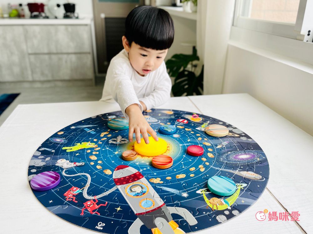 最後把每一顆立體行星放到對應的位子上就完成啦!行星的背後都有做圓圓的凸起,可以剛好放入拼圖的凹槽中!