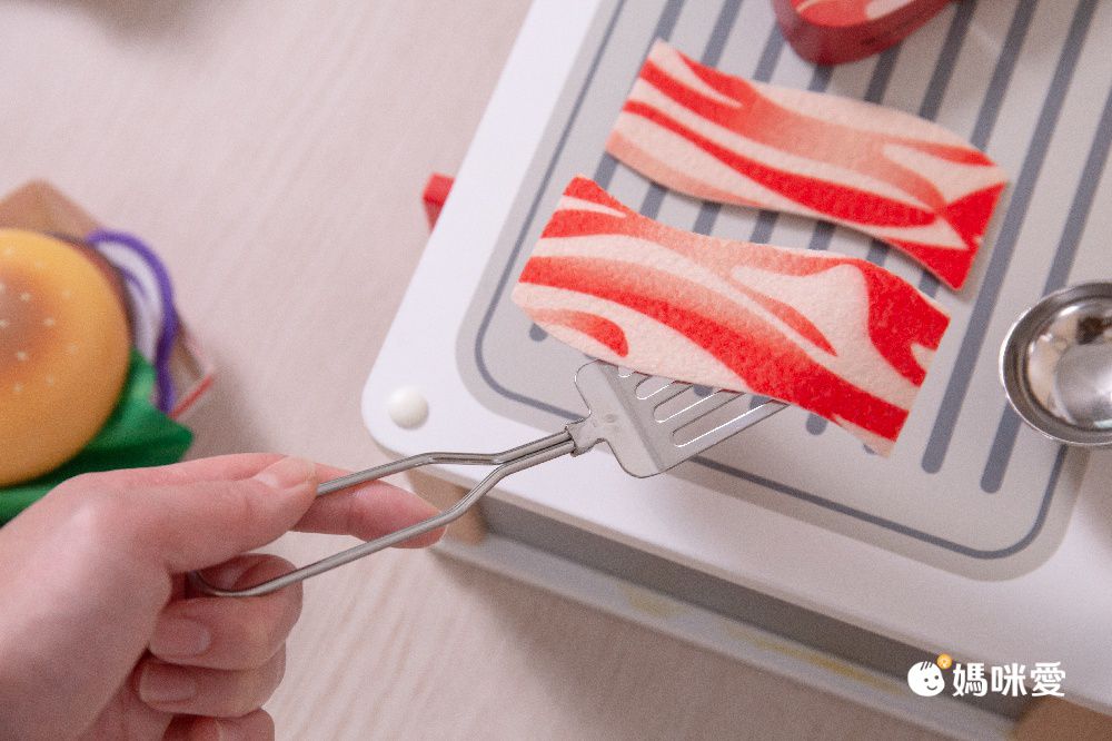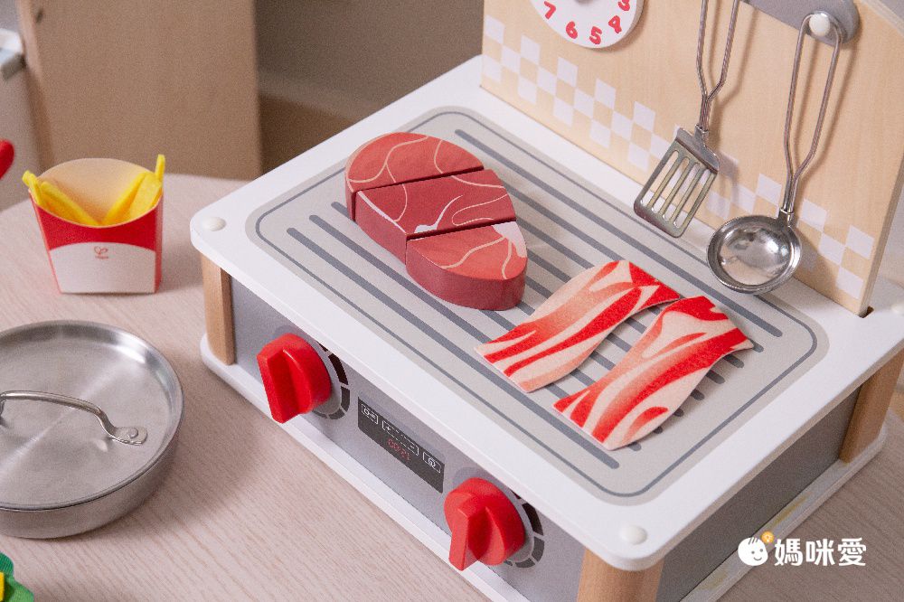 這款最吸引人的地方就是這套縮小版的金屬鍋具、廚具!雖然說是金屬製,但是拿起來不會太重也不太有負擔,孩子小手也很好操作!
