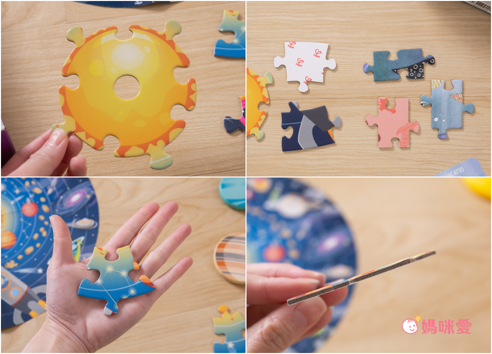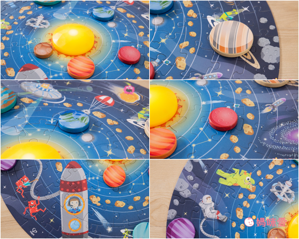 這組拼圖非常特別的點是,它不僅有平面的拼圖,還有木製的立體拼圖塊,甚至還有顆 LED 太陽!同時有附上一張解說海報,讓孩子可以邊對照邊拼!