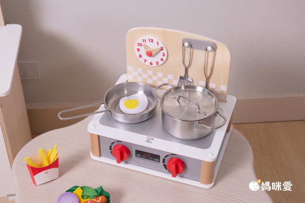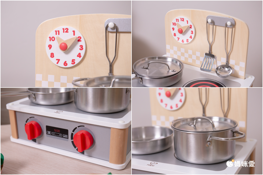 雖然是迷你小巧版,但廚房裡面該有的都不會少!有時鐘、吊掛廚具的地方、兩個瓦斯爐、金屬的平底鍋&湯鍋、可以轉動的旋鈕~其中,轉動旋鈕還會發出「咯咯」聲,非常細心的仿真設計,讓孩子更加融入真實煮飯情境當中~