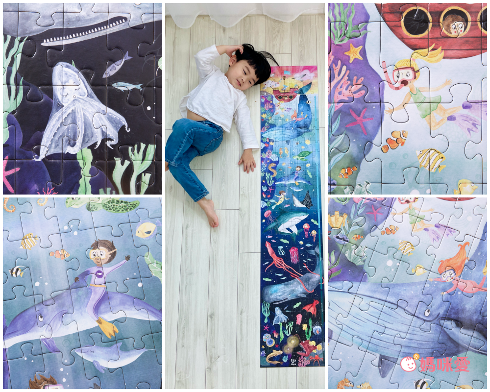 終!於!完成啦~~真的非~~常的大呀!連媽媽我都很驚呼的 1.5M 哈哈~不過這款拼圖從海平面到深海一次包辦!幾乎把淺海、中層帶、深海中常聽到的生物,像是小丑魚、鯨魚、燈籠魚呀等等的都放進拼圖中了,還有浮潛&深潛的人們也伴隨在其中!