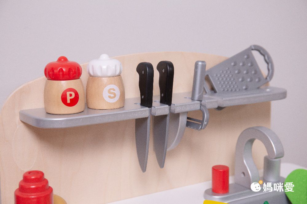 廚檯上方有一排可以放置調味料、刀架的區域!這讓編媽超驚豔的~跟真實廚房會有的收納層架一樣!