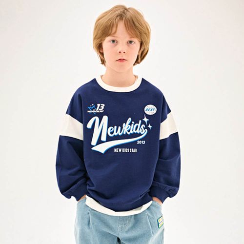 韓國 Jelispoon - 美式Newkids文字長袖大學T-海軍藍