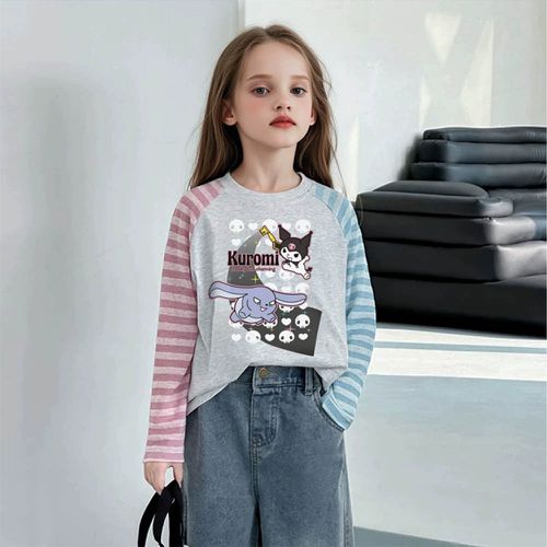 人氣卡通 - 甜美條紋撞色長袖T恤-卡通人物酷洛米-灰色