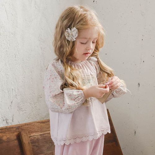 韓國南大門童裝 - Puellaflo 浪漫兔子花漾拼接長袖上衣-淡粉