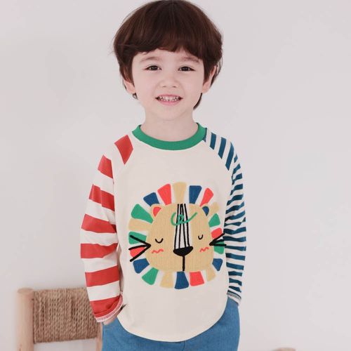 韓國南大門童裝 - Coco rabbit 彩色獅子條紋長袖上衣-綠領-橘紅X藍綠