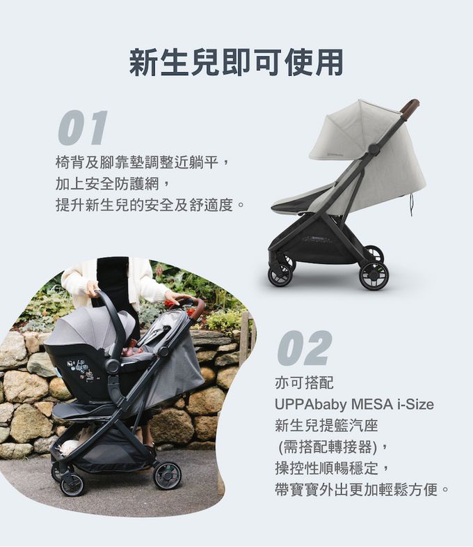 -操控性順暢穩定,新生兒乘坐更加安全。可搭配MESA i-Size 新生兒提籃(需搭配轉接器)