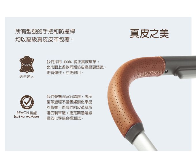 • 手把和防撞桿以REACH認證的真皮皮革包覆