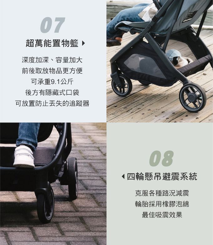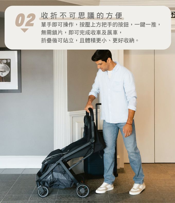 -單手收合與展開推車,並能獨立站立
