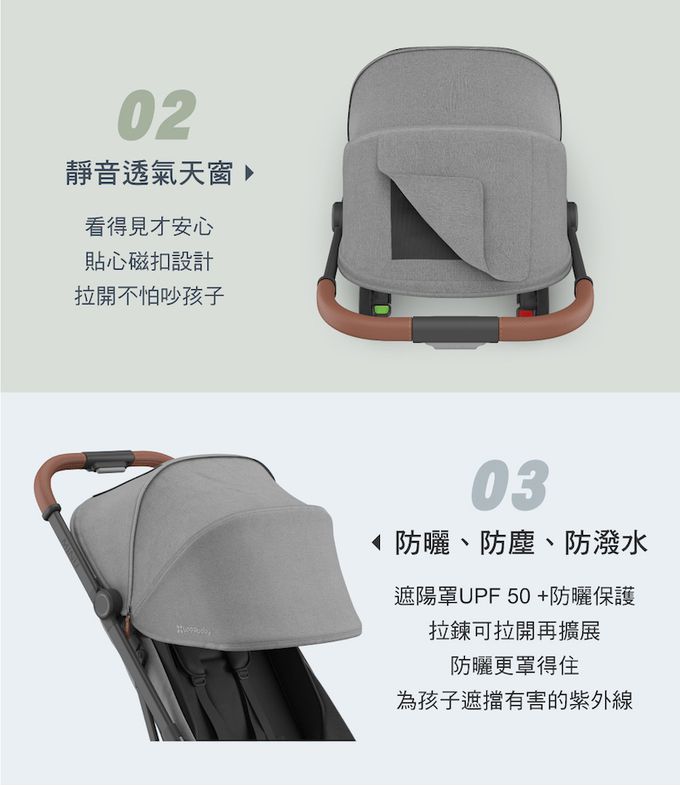 -可伸展的遮陽蓬,具有防潑水功能,及防曬係數超過UPF 50+,可遮擋有害的紫外線。易開啟且透氣的通風窗,可隨時觀看寶寶的狀況。