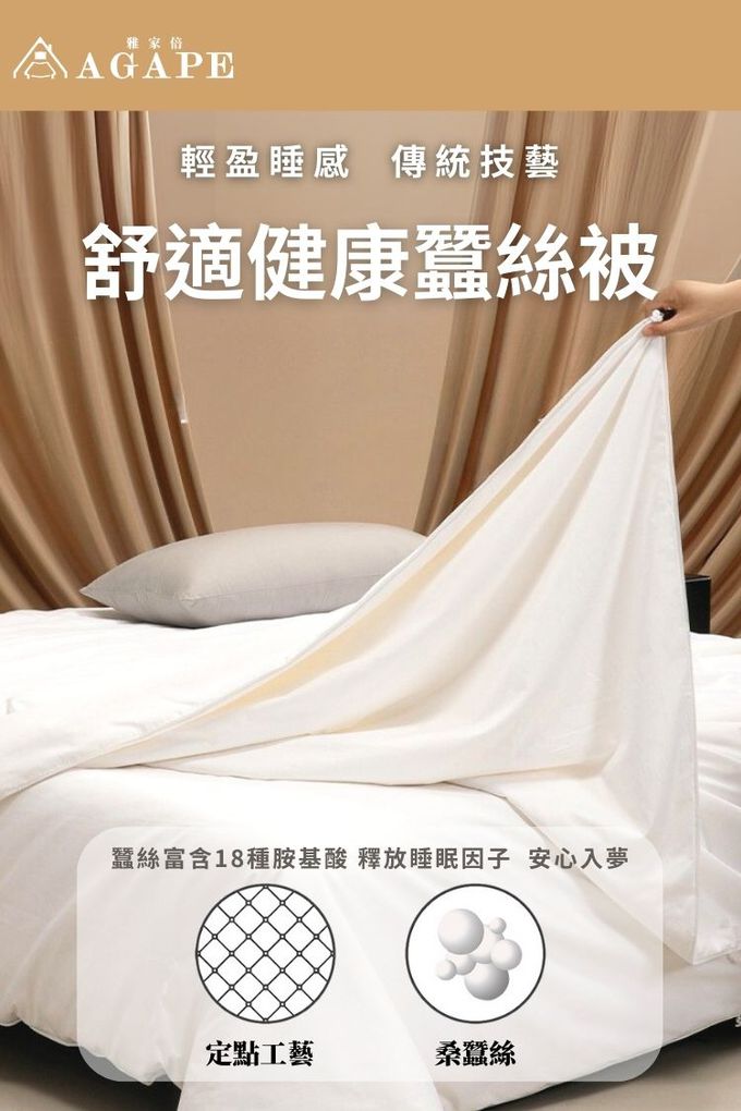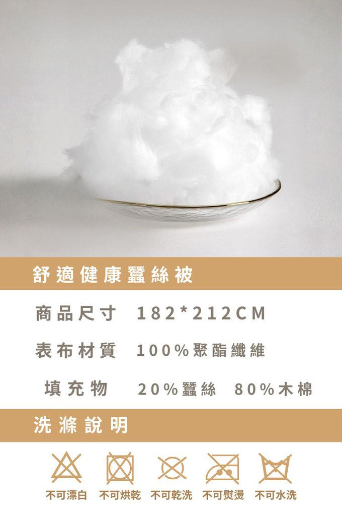 ◆尺寸:雙人6x7尺(180x210公分)◆材質: 布表:100%聚酯纖維填充物:20%蠶絲+80%木棉◆重量:3KG (誤差值:±5%)◆產地:中國製(台灣優良廠商監製)◆保養方式:不可水洗/不可乾洗/不可漂白/不可烘乾/不可熨燙及壓燙*需外加被套,以防止勾紗及減少汗液沾黏。