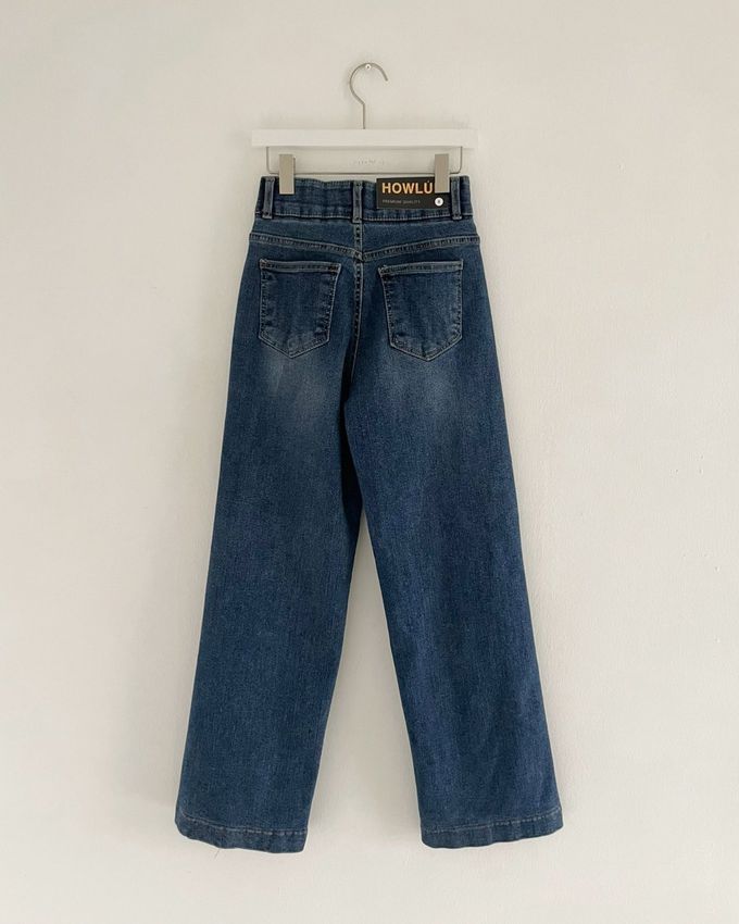 韓國女裝連線 - Howluk (內磨毛)雙釦彈性腰直筒丹寧褲-中青