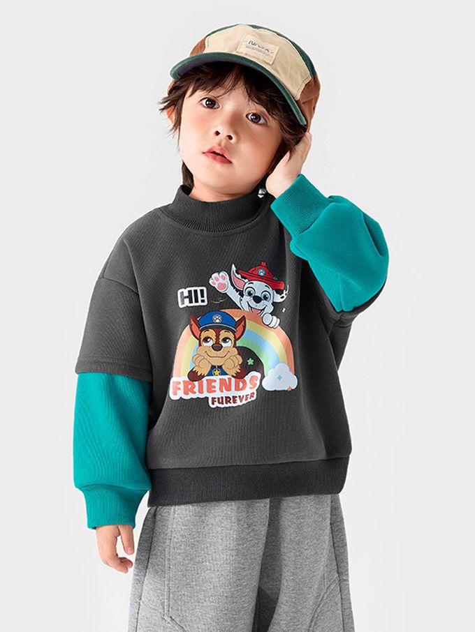 卡通汪汪隊加絨半高領假兩件長袖上衣-卡通人物阿奇-拼色深灰