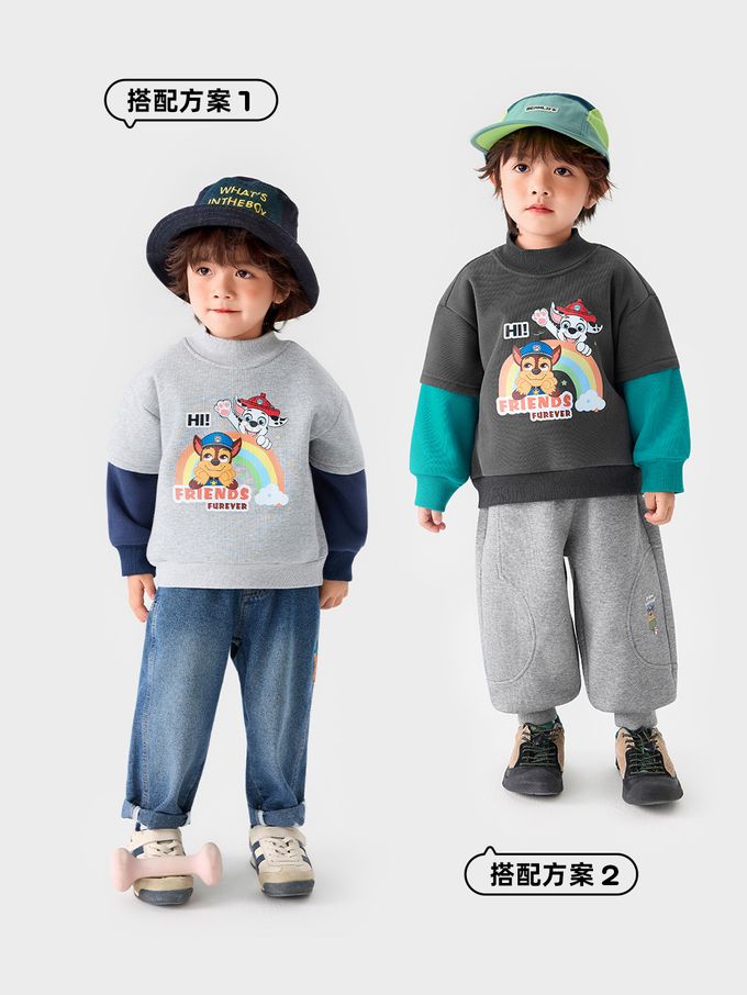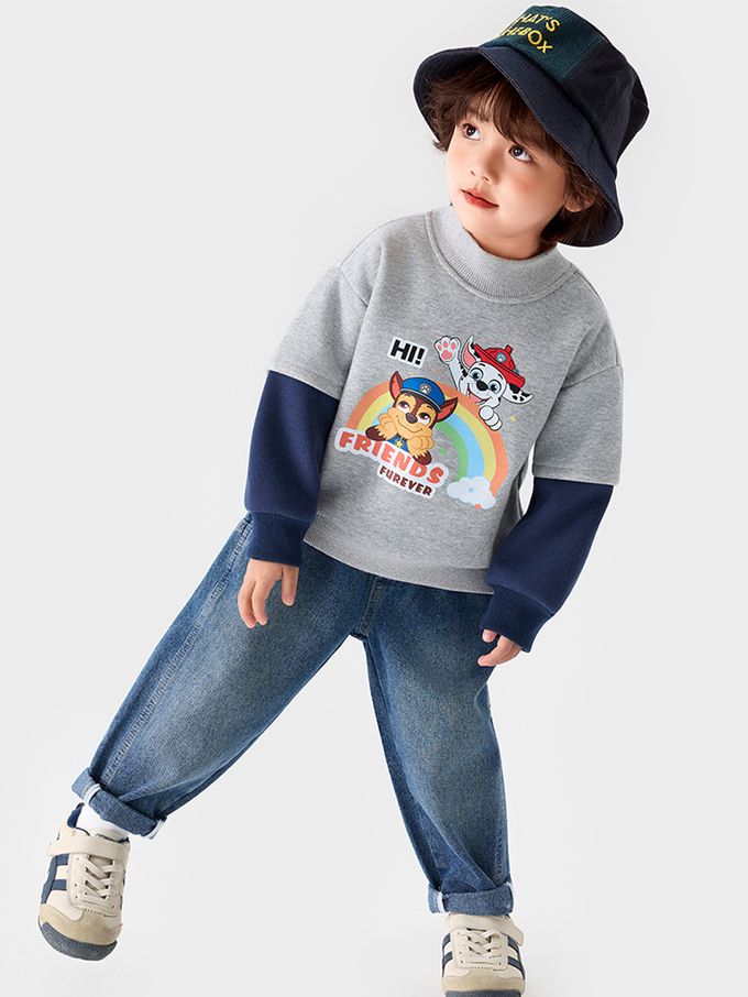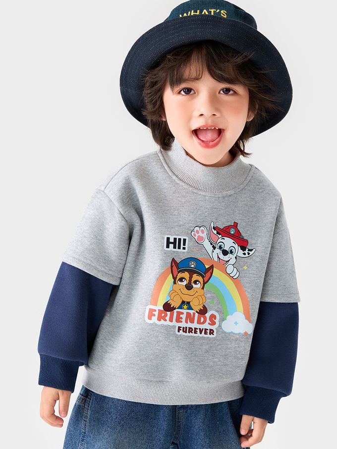卡通汪汪隊加絨半高領假兩件長袖上衣-卡通人物阿奇-拼色灰