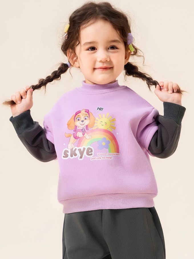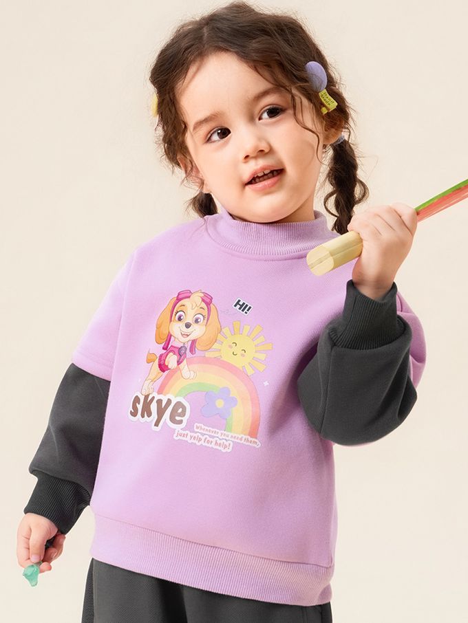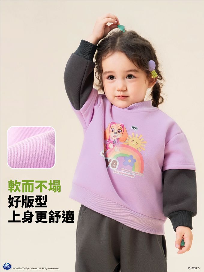 卡通汪汪隊加絨半高領假兩件長袖上衣-卡通人物天天-拼色粉紫