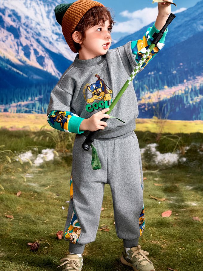 卡通汪汪隊加絨彈性運動束口長褲-卡通人物阿奇-拼色灰