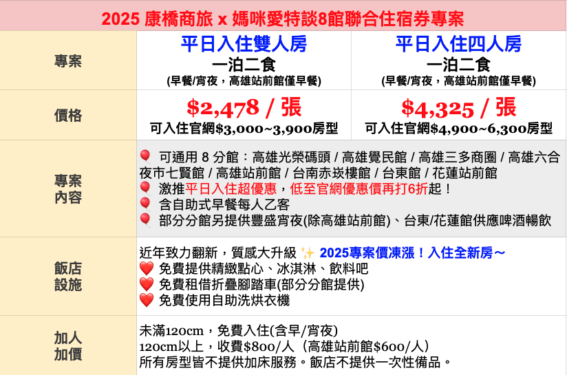註:本次住宿券為「平日入住雙人房」與「平日入住四人房」,可以優惠價兌換入住康橋商旅/康橋旅館事業旗下八間分館之指定房型。