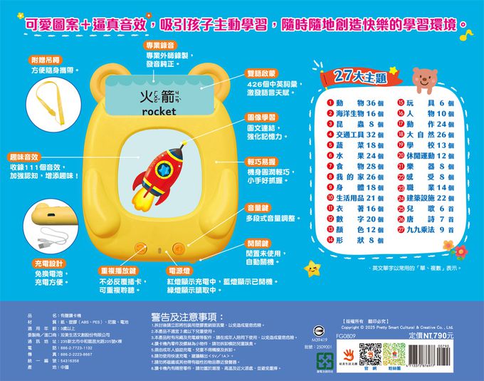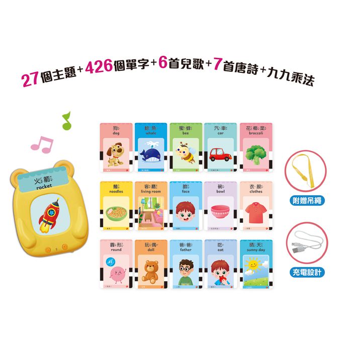 224張雙面字卡,內含426個中英文單字(含注音),可愛插圖搭配音效,圖文連結幫助記憶,還有6首雙語兒歌、7首經典唐詩、數學九九乘法,邊唸邊唱、增添學習趣味。
