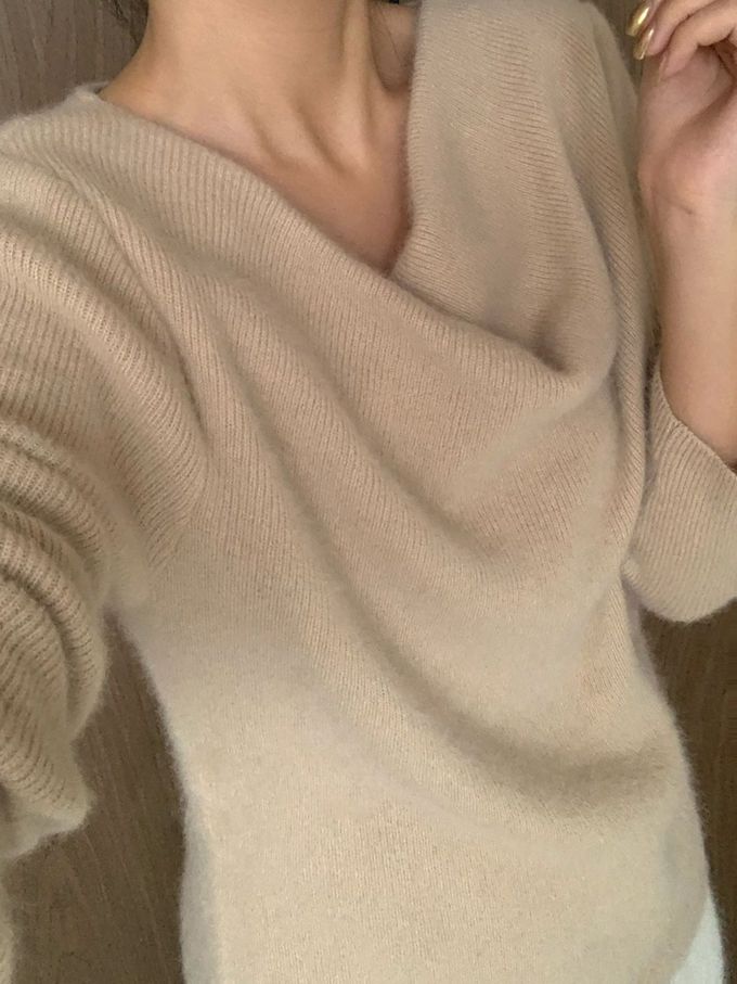 韓國女裝連線 - 溫柔垂墜領腰際抓褶羊毛針織上衣-杏 (FREE)
