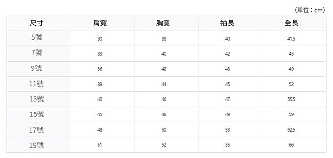 (上表為參考平均年齡/體型所制定,每位孩童成長狀況不同,請斟酌參考模特兒及尺寸資訊再行選購)