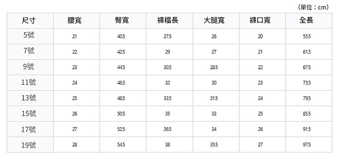 1. 尺寸表單位皆為公分(cm),實際尺寸會因布料彈性、水洗、測量起迄點等因素略有誤差。建議參考孩子平時穿著衣物尺寸進行選購。