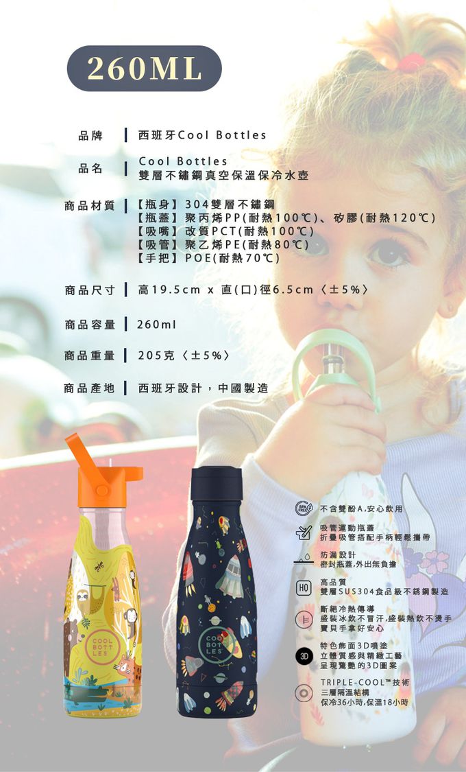 材質:【瓶身】304雙層不鏽鋼、【瓶蓋】聚丙烯PP〈耐熱溫度 100度C〉、矽膠〈120度C〉、【吸嘴】改質PCT〈耐熱溫度 100度C〉、【吸管】聚乙烯PE〈耐熱溫度 80度C〉、【手把】POE〈耐熱溫度 70度C〉