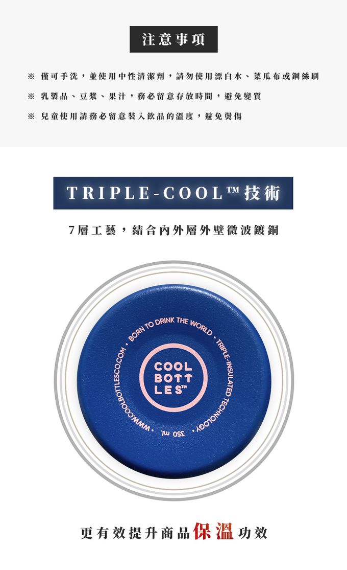 注意事項:※ 注 意 事 項(1):僅可手洗,並使用中性清潔劑。請勿使用漂白水、菜瓜布或鋼絲刷洗。 ※ 注 意 事 項(2):乳製品、豆漿、果汁,務必留意存放時間,避免變質。 ※ 注 意 事 項(3):兒童使用請務必留意裝入飲品的溫度,避免燙傷。
