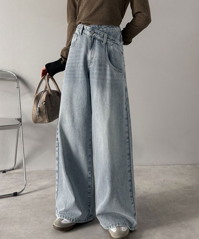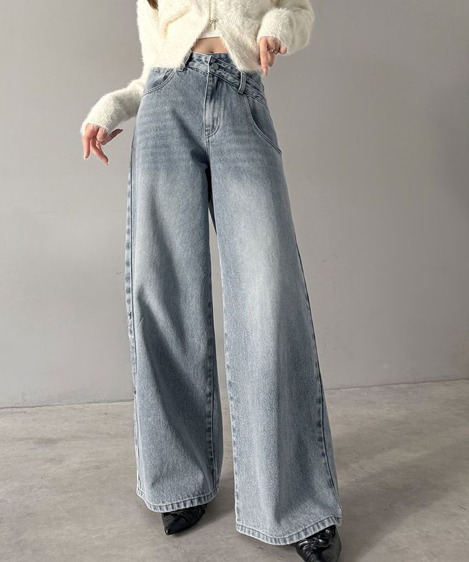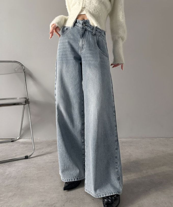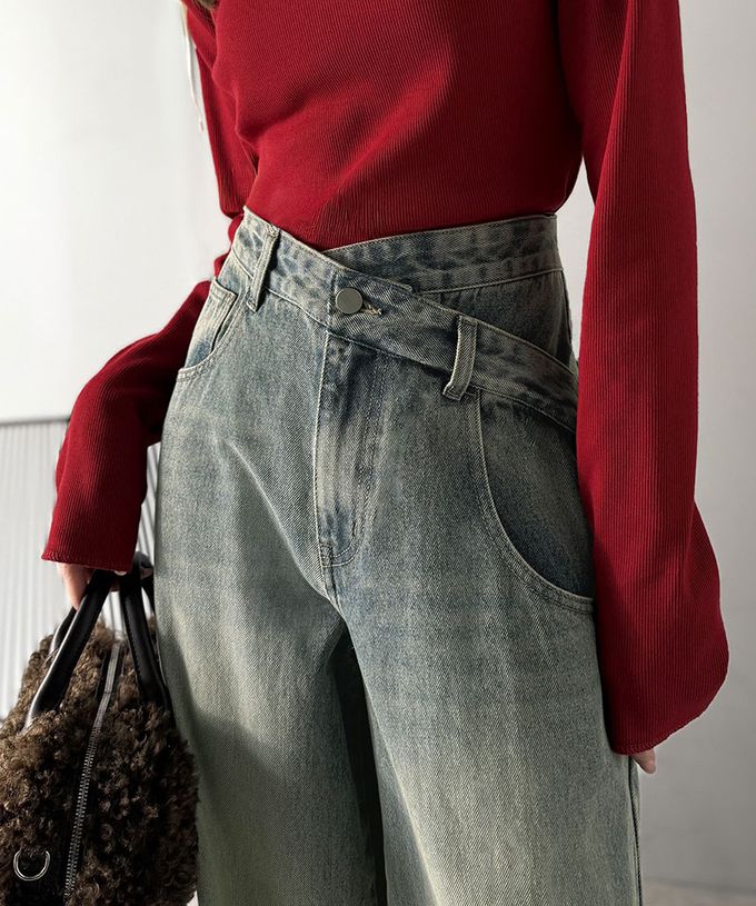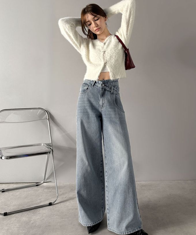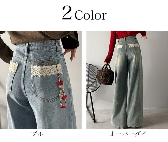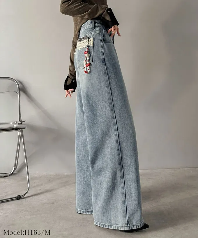• 品名:甜心蕾絲口袋交叉腰寬版長腿丹寧褲