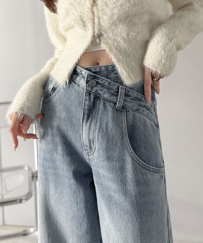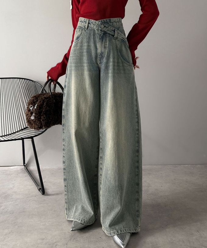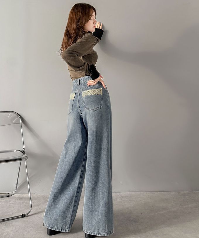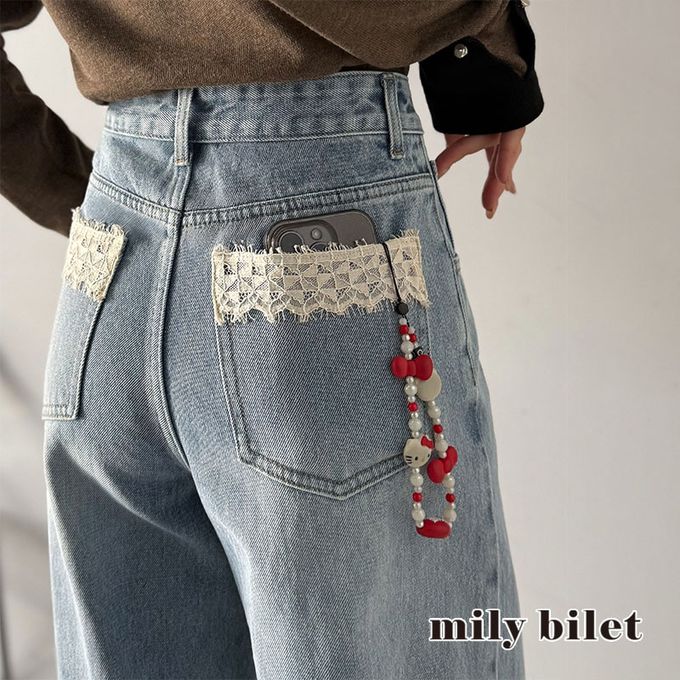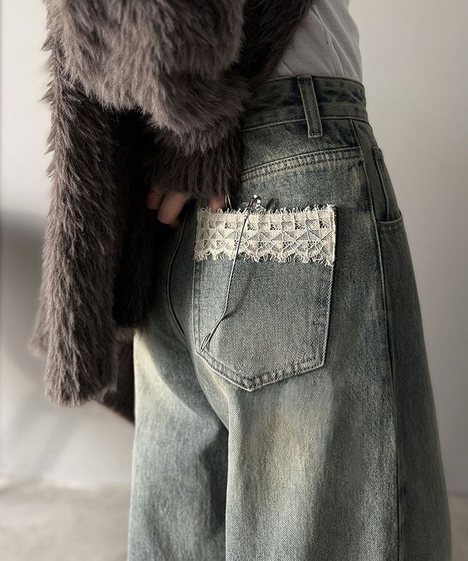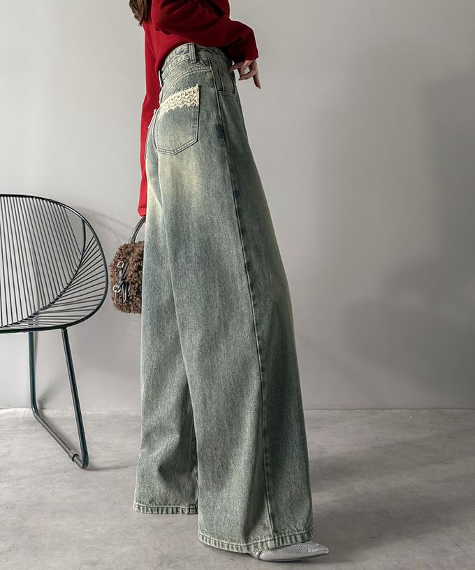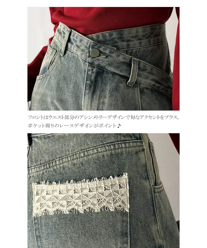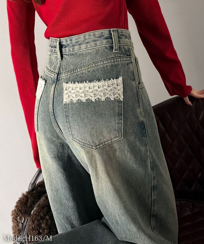 • 品名:甜心蕾絲口袋交叉腰寬版長腿丹寧褲