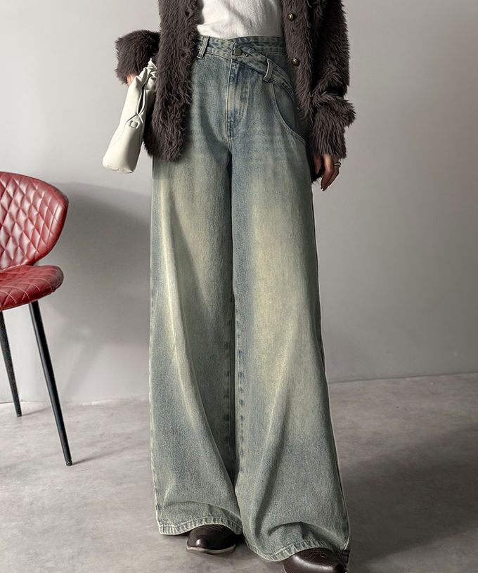 日本 Classical Elf - 甜心蕾絲口袋交叉腰寬版長腿丹寧褲-刷色