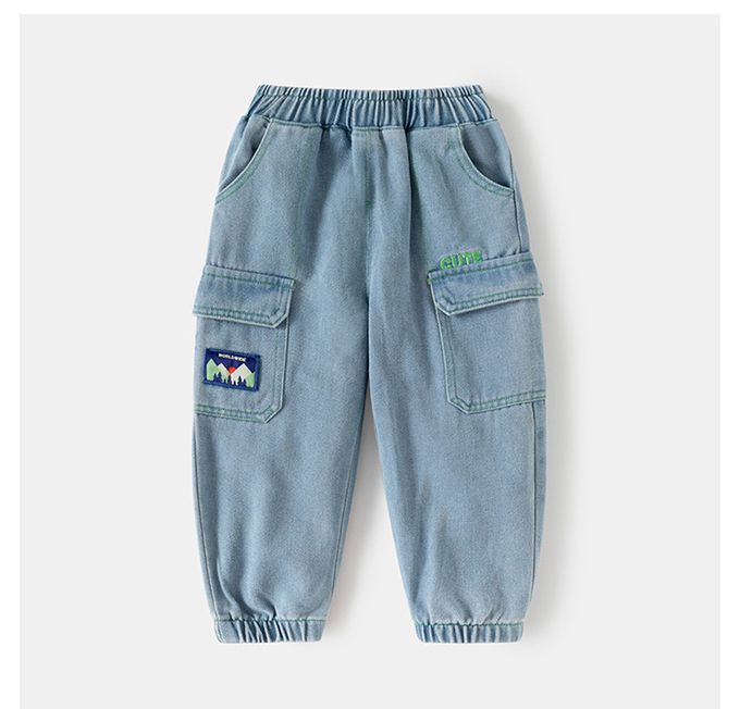 腰鬆緊休閒牛仔長褲-貼布刺繡-淺藍