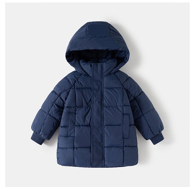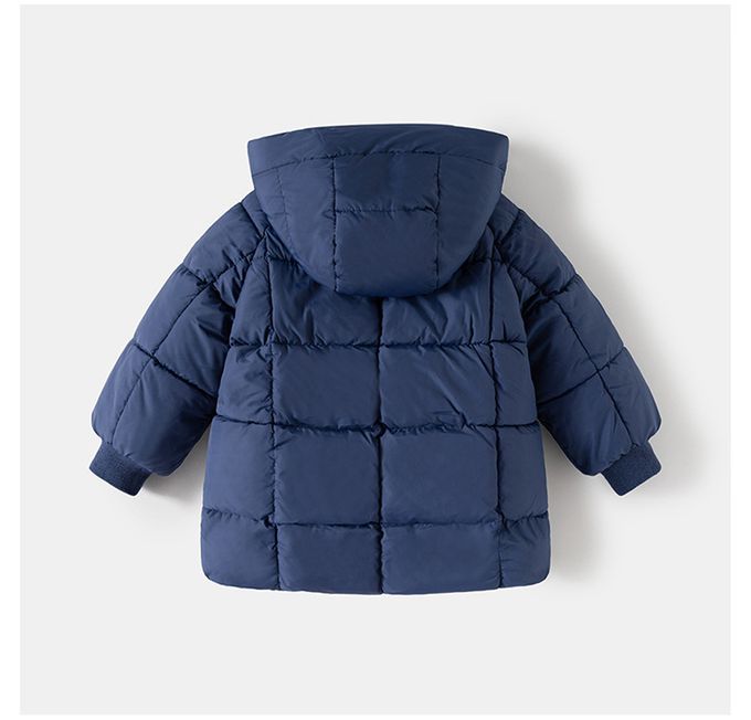 中長款保暖鋪棉連帽外套-格子壓紋-藏青