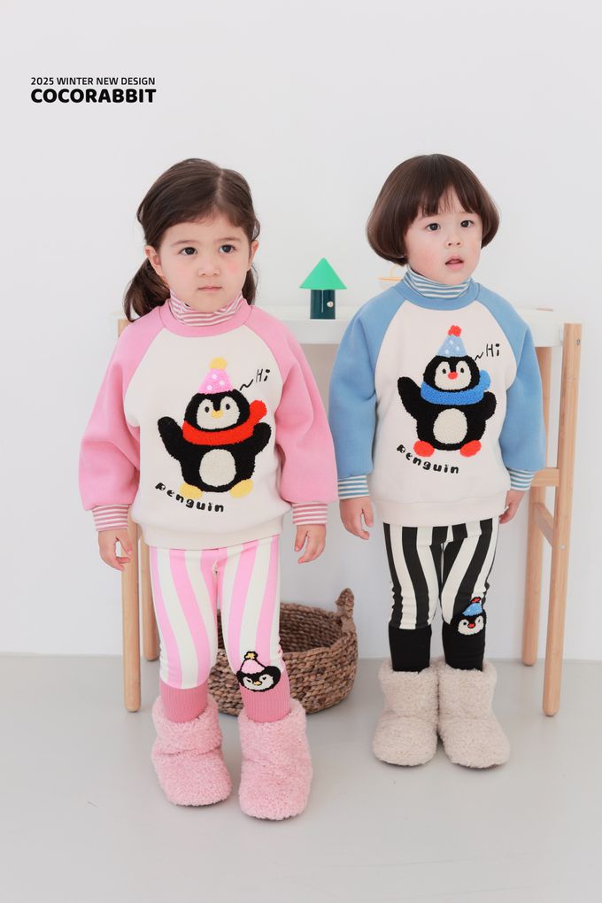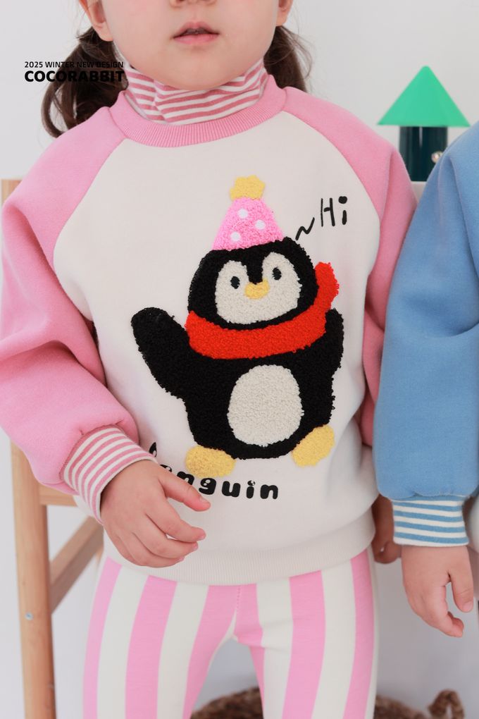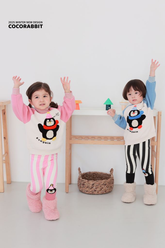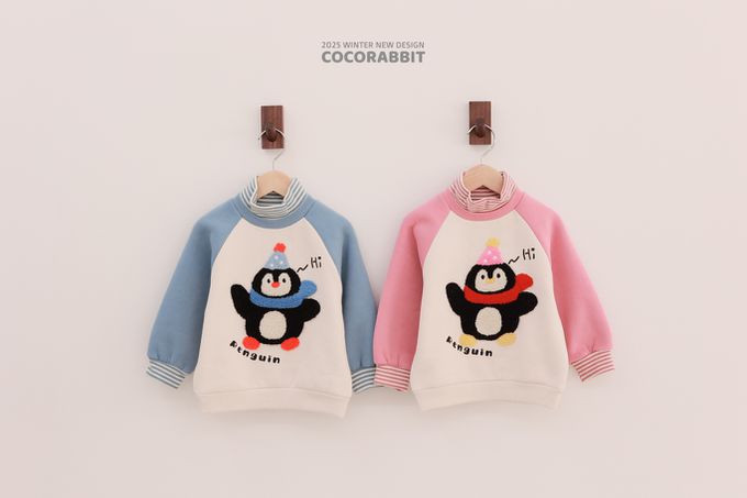 韓國南大門童裝 - Coco rabbit (內磨毛)條紋高領長袖大學T-毛絨企鵝-粉