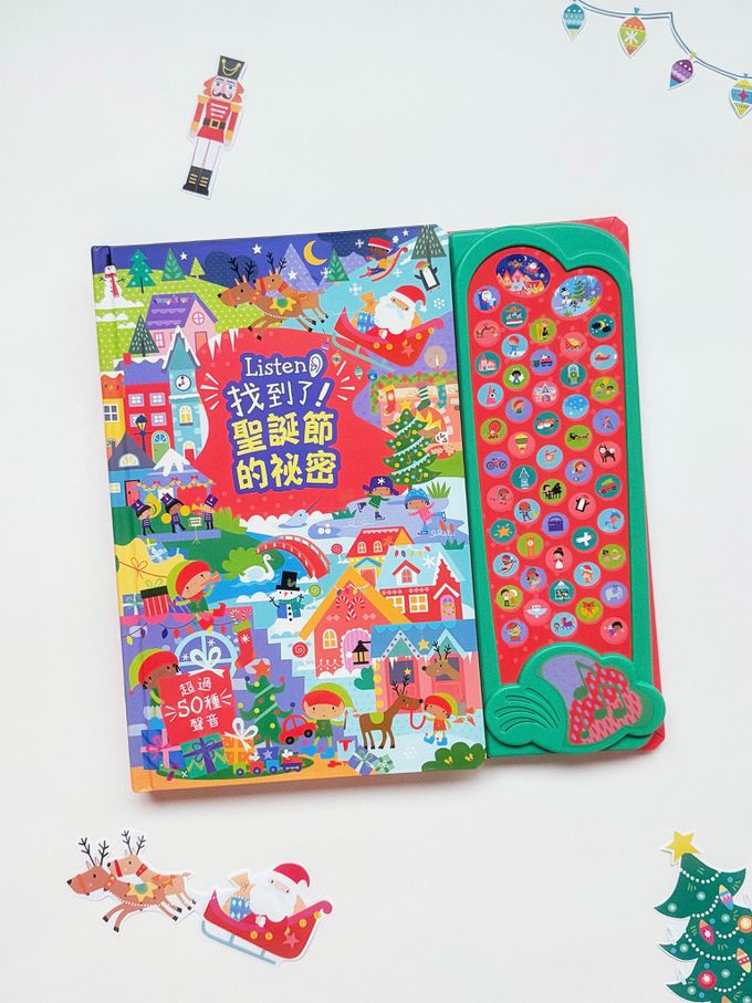 本書不只是音效書,也結合了「找找看」的遊戲!先觀察每個主題的10個聖誕節元素,再打開折頁,從精緻又豐富的各個場景中,找出這10個聖誕元素,不只培養小朋友的專注力、觀察力、耐心,還能學習解決問題的能力,讓孩子邊聽邊玩,樂在其中!
