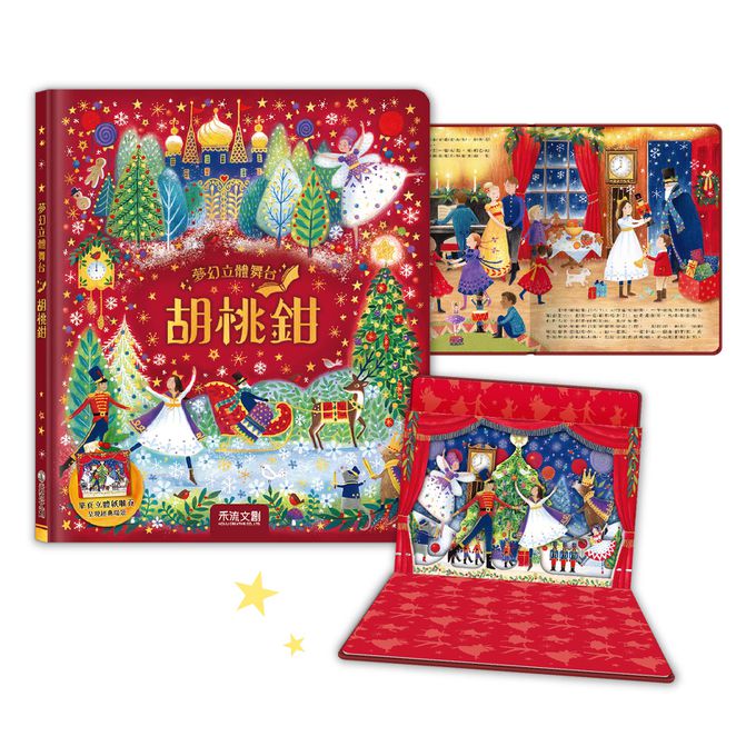 書內附上一頁精緻的立體紙雕,展現克拉拉與胡桃鉗王子共舞的場面。繪圖細緻、色彩豐富,將充滿想像力的文字描繪的夢幻畫面具體呈現在眼前。適合擺在桌上、床頭櫃,成為生活中美麗的裝飾。
