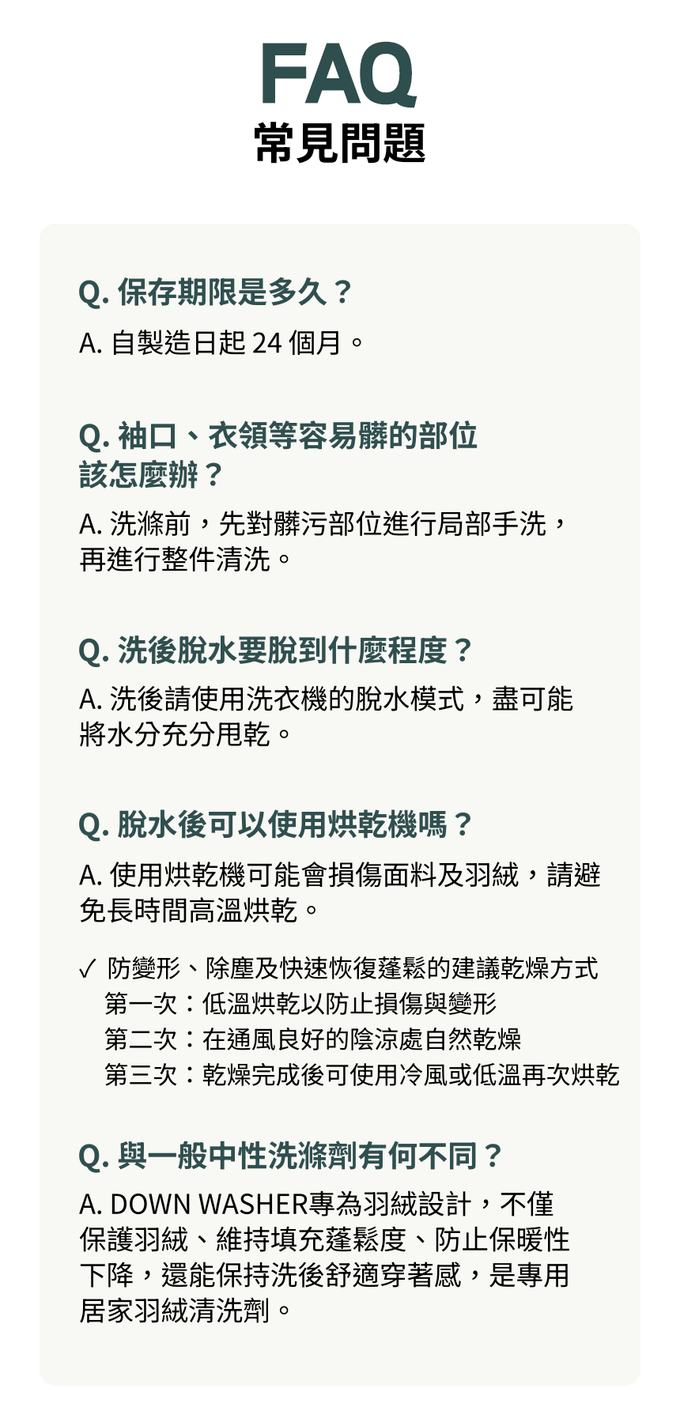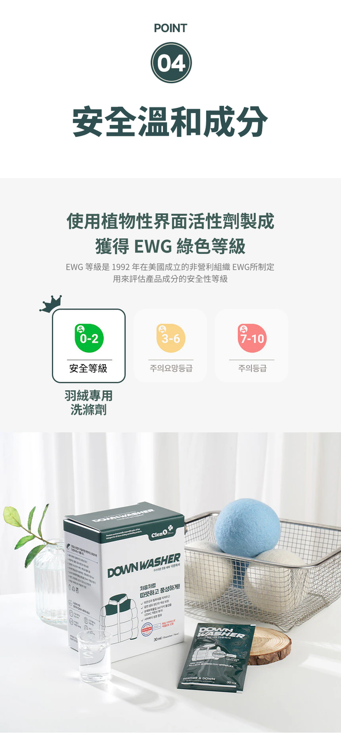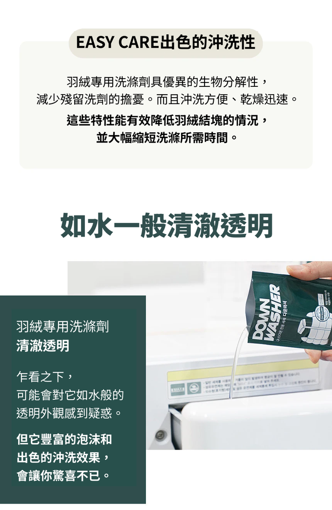 DOWN WASHER 是一款 對人體安全、對自然無害 的專用羽絨洗劑。它以品牌多年研製羽絨產業專業清潔溶劑的技術為基礎,經過 2 年研發 誕生,專為羽絨特性設計,讓清洗效果與蓬鬆修復更兼具。