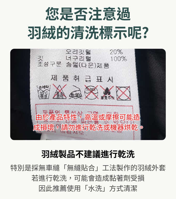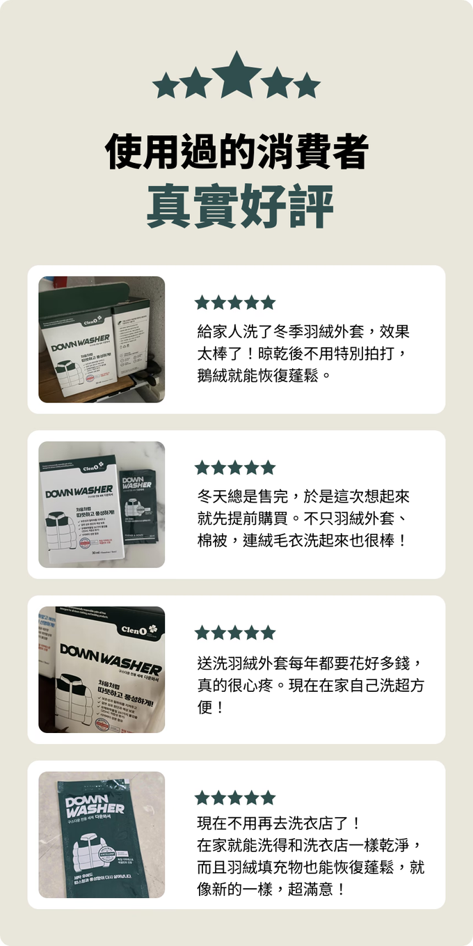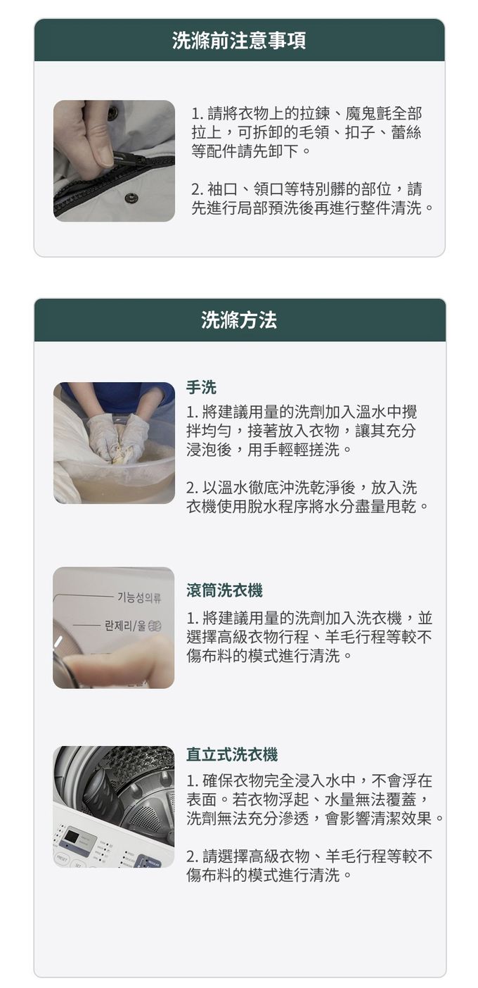 往往穿完一季後就得送洗,不但費用高、時間久,還常常洗完變扁、變硬、保暖度下降,麻煩又心疼。