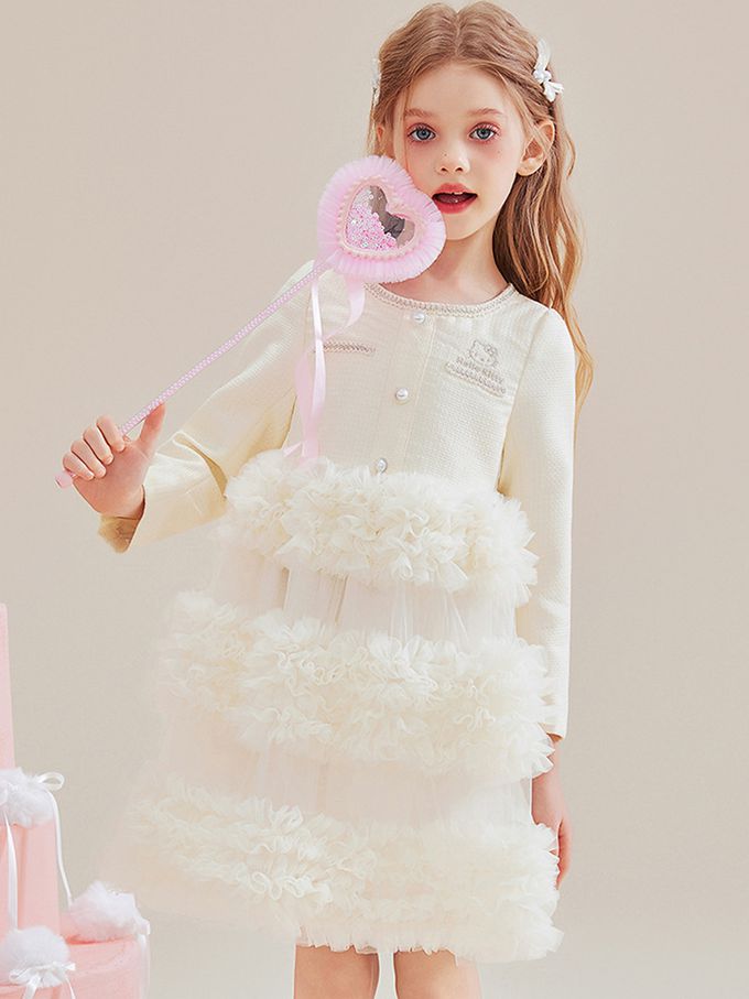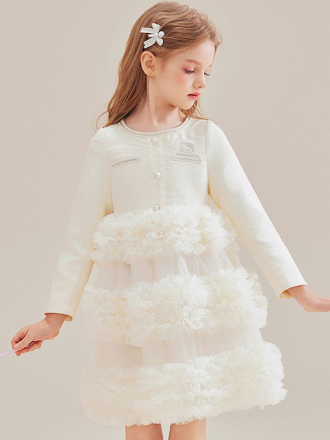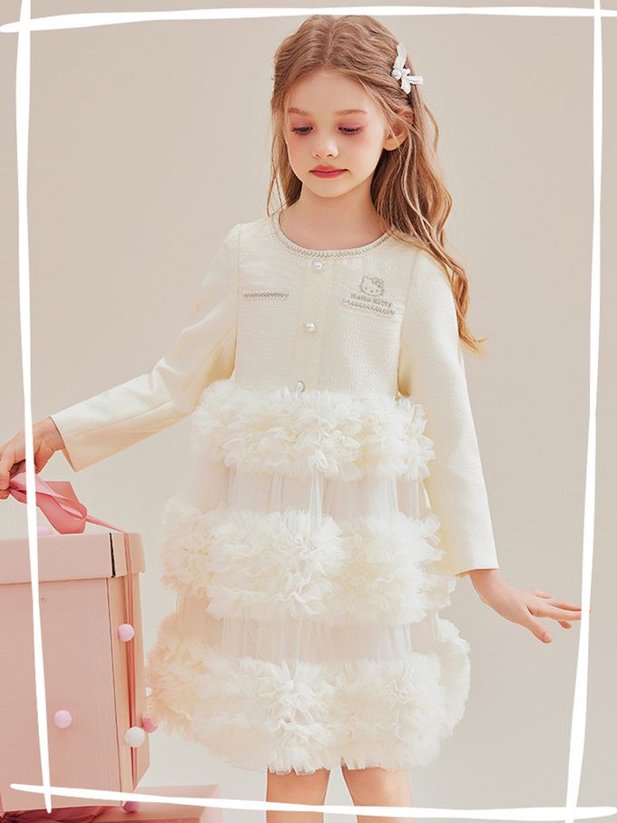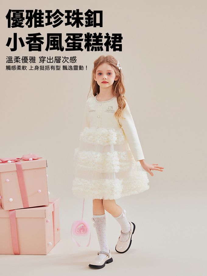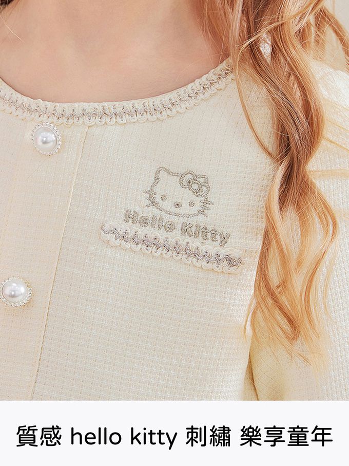 優雅珍珠釦小香風蛋糕裙-卡通人物Hello Kitty-米杏