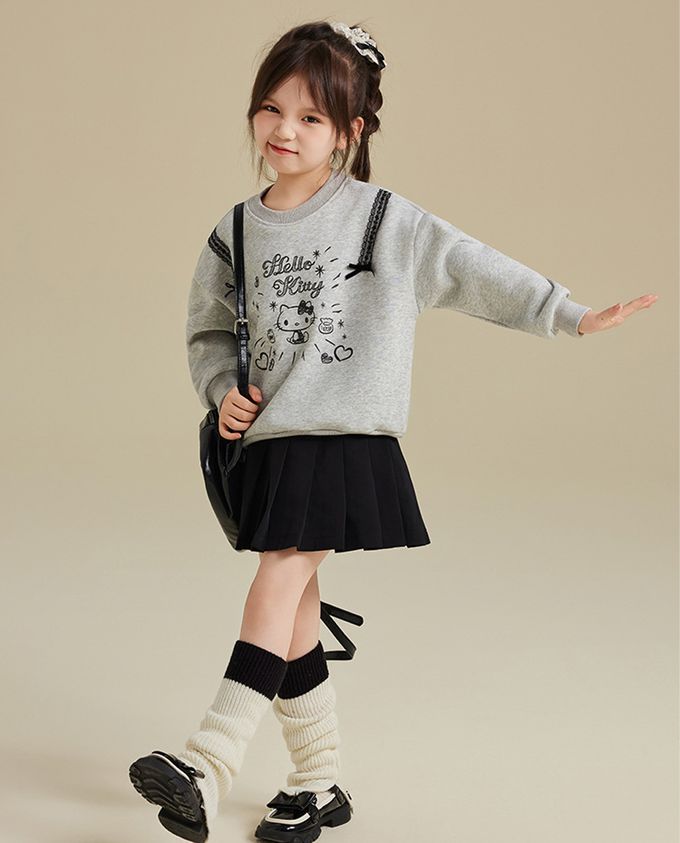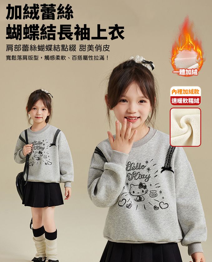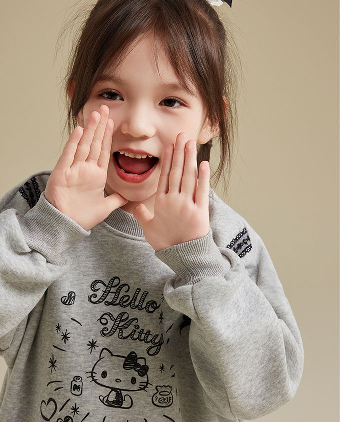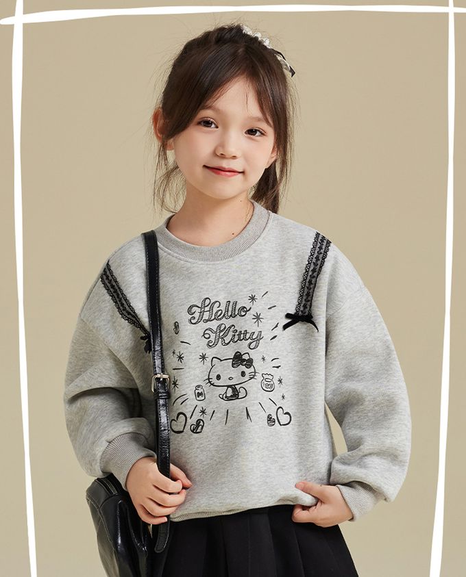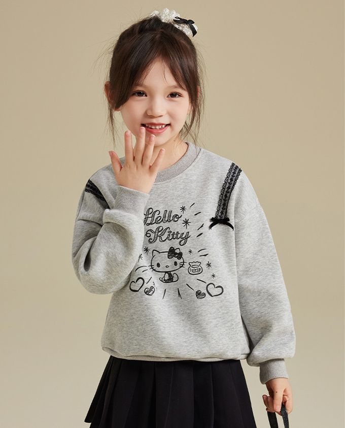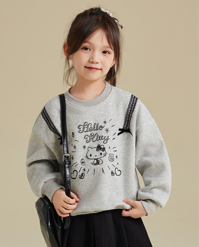加絨蕾絲蝴蝶結長袖上衣/大學T-卡通人物Hello Kitty-灰色