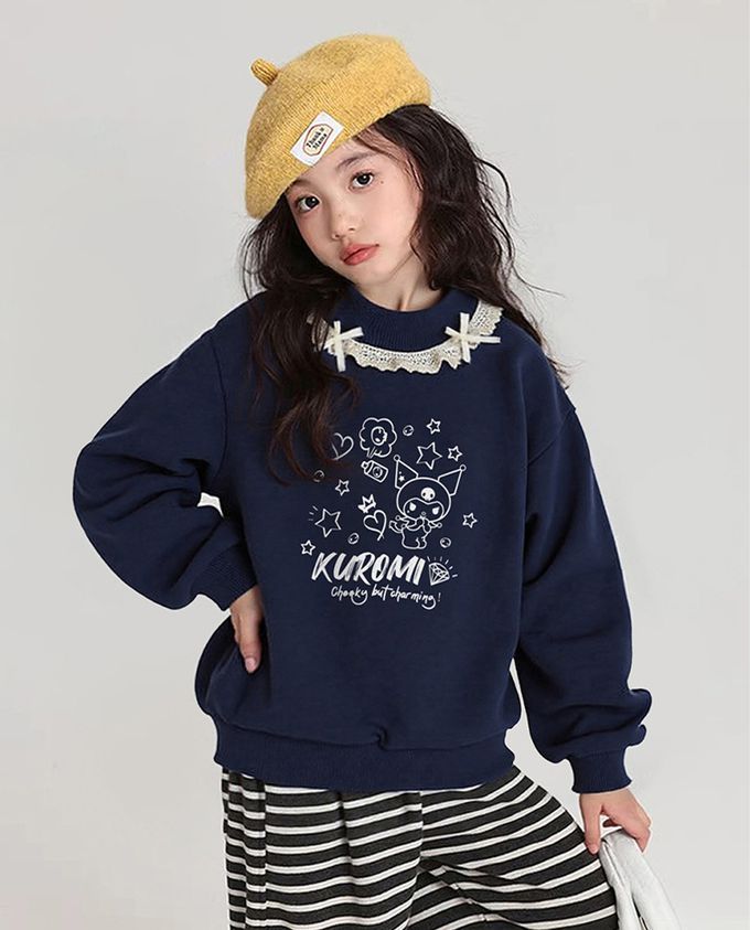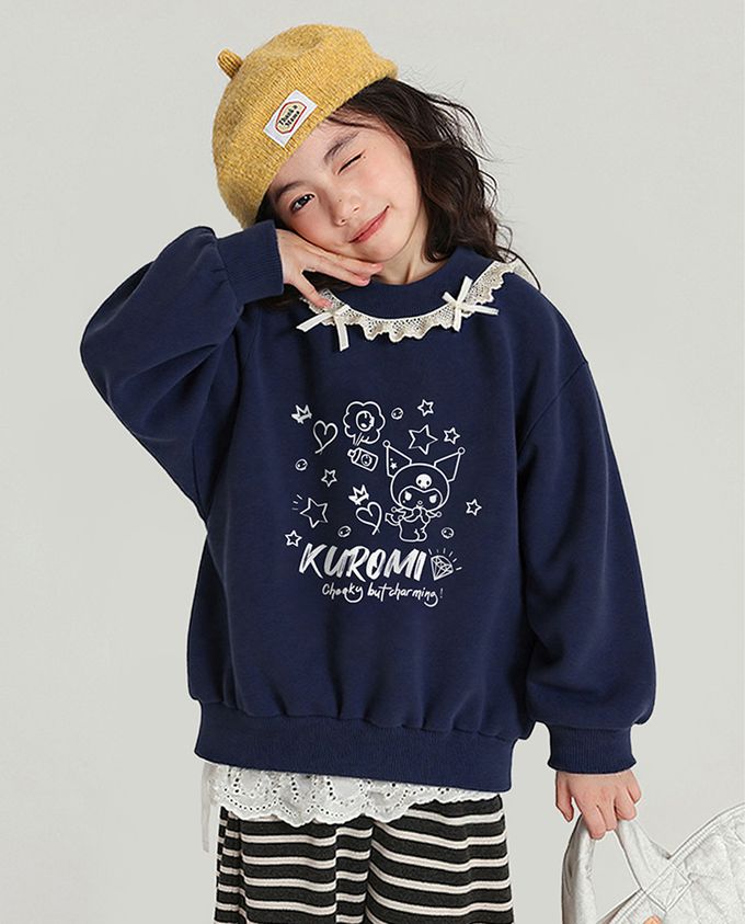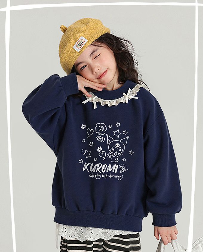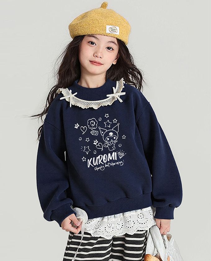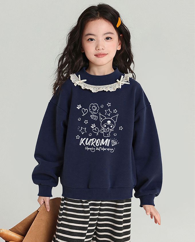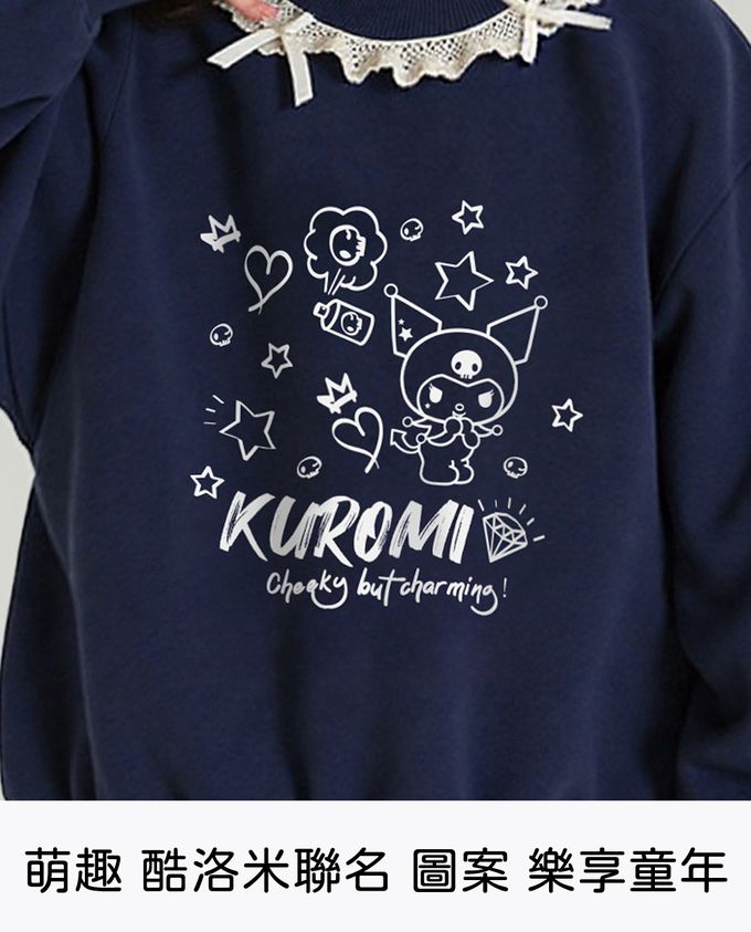 加絨蕾絲花邊領長袖上衣/大學T-卡通人物酷洛米-藏青