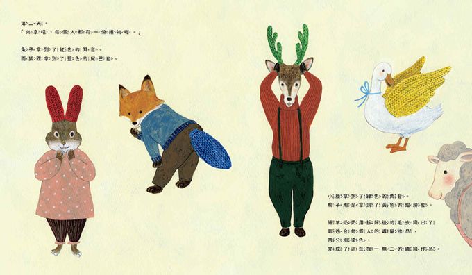 有一天,大熊將已經穿不下的毛衣交給了綿羊奶奶。