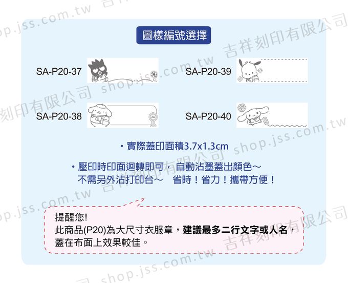 • 品名:三麗鷗明星學校-小男孩(2) 抗菌衣物印章-黑色墨-P20 [印面尺寸: 3.7x1.3cm]-印面尺寸: 3.7x1.3cm