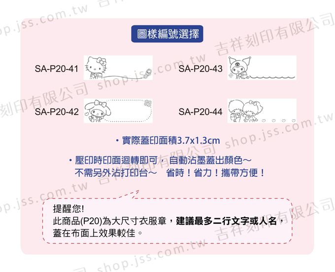 • 品名:三麗鷗明星學校-小女孩(2) 抗菌衣物印章-黑色墨-P20 [印面尺寸: 3.7x1.3cm]-印面尺寸: 3.7x1.3cm