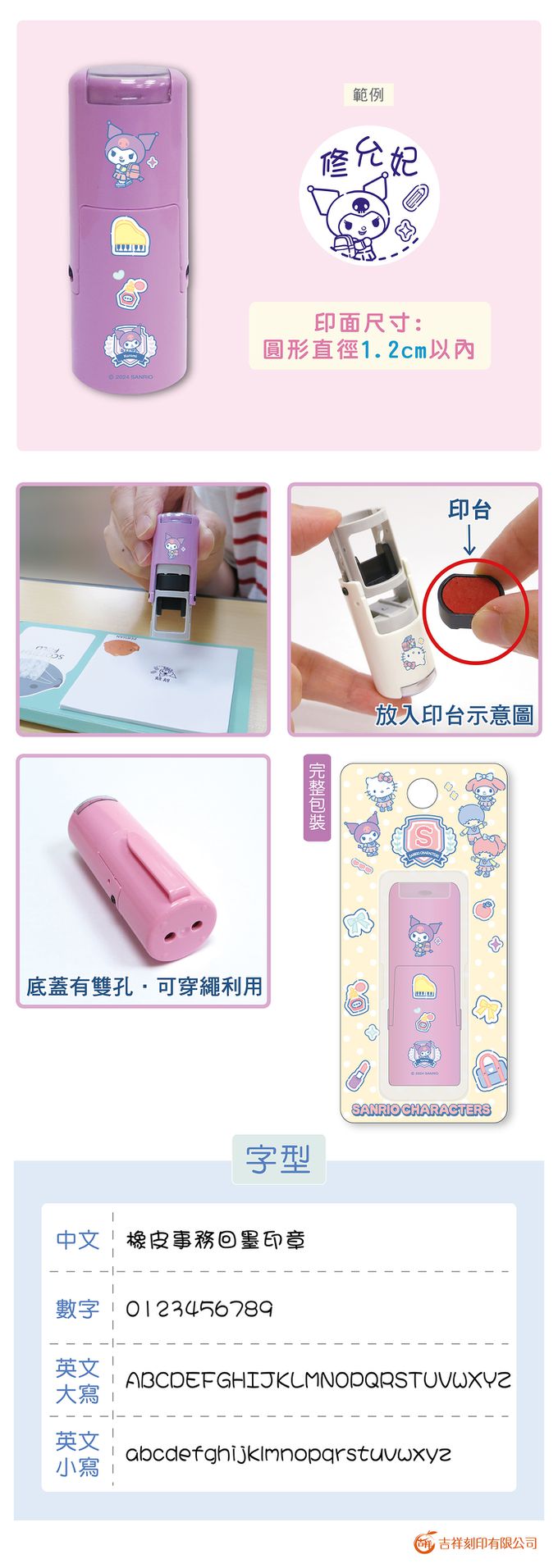 • 品名:三麗鷗明星學校-小女孩(3) 橡皮事務回墨印章/小圓章-紫色墨-印面尺寸:圓形直徑1.2cm