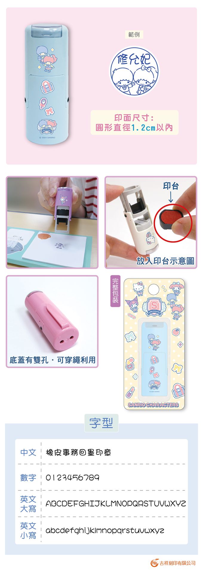 • 品名:三麗鷗明星學校-小女孩(4) 橡皮事務回墨印章/小圓章-藍色墨-印面尺寸:圓形直徑1.2cm