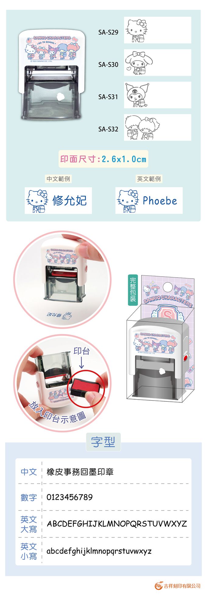 吉祥刻印 - 三麗鷗明星學校-小女孩(3) 橡皮事務回墨印-藍色墨-印面尺寸:2.6x1.0公分