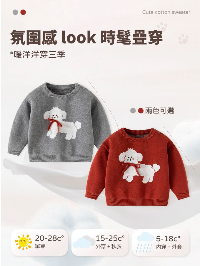 純棉圓領針織長袖上衣-蝴蝶結小狗-紅色